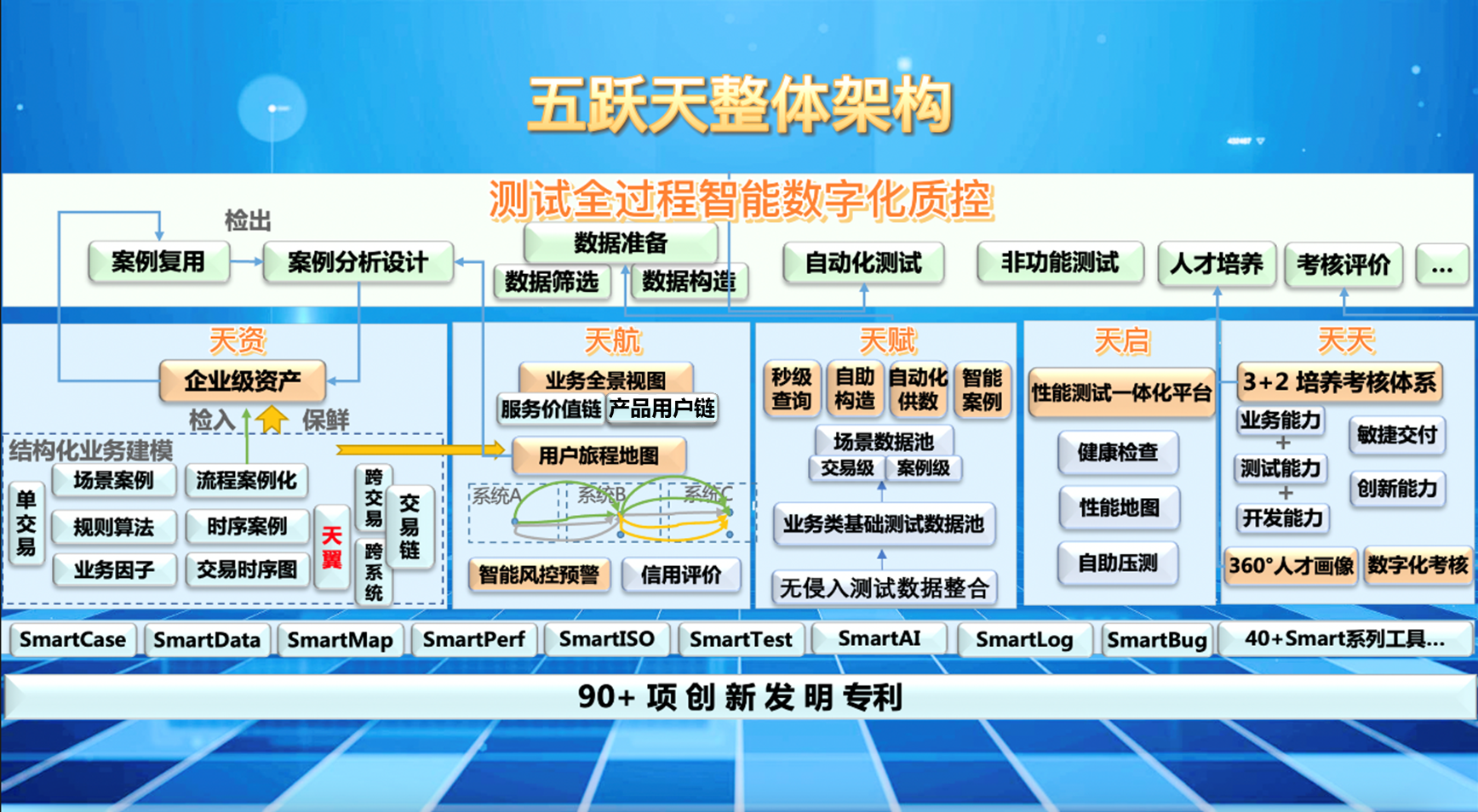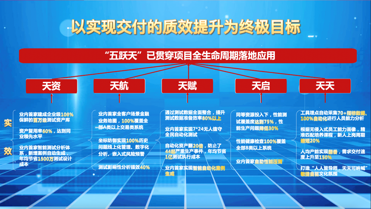 五躍天通過"天資"、"天航"、"天賦"、"天啟"、"天天"五大平臺緊密配合,實現(xiàn)了五位一體的全方位質(zhì)控生態(tài),打造了多項業(yè)內(nèi)第一,率先將復(fù)雜金融業(yè)務(wù)映射為可感知、可鏈接、可智能分析的數(shù)字世界。其中"天資"利用AI算法完成大規(guī)模銀行系統(tǒng)業(yè)務(wù)建模,填補了測試分析設(shè)計自動化的行業(yè)空白,建成了企業(yè)級100%保鮮的百萬級測試資產(chǎn)庫。"天航"創(chuàng)造了全客戶場景金融業(yè)務(wù)地圖,無侵入式智能預(yù)警風(fēng)險。"天賦"實現(xiàn)了7*24小時無人值守的全民自動化測試,助力自動化測試跨越式發(fā)展資產(chǎn)積累翻20倍,躍升行業(yè)第一梯隊。"天啟"提供了自助式性能健康檢查及性能壓測一站式服務(wù)平臺,高效提升性能測試覆蓋度達到75%。"天天"建立360°人才畫像,數(shù)字化精準(zhǔn)培養(yǎng)與客觀考核體系,新人上崗周期成功提速20%。