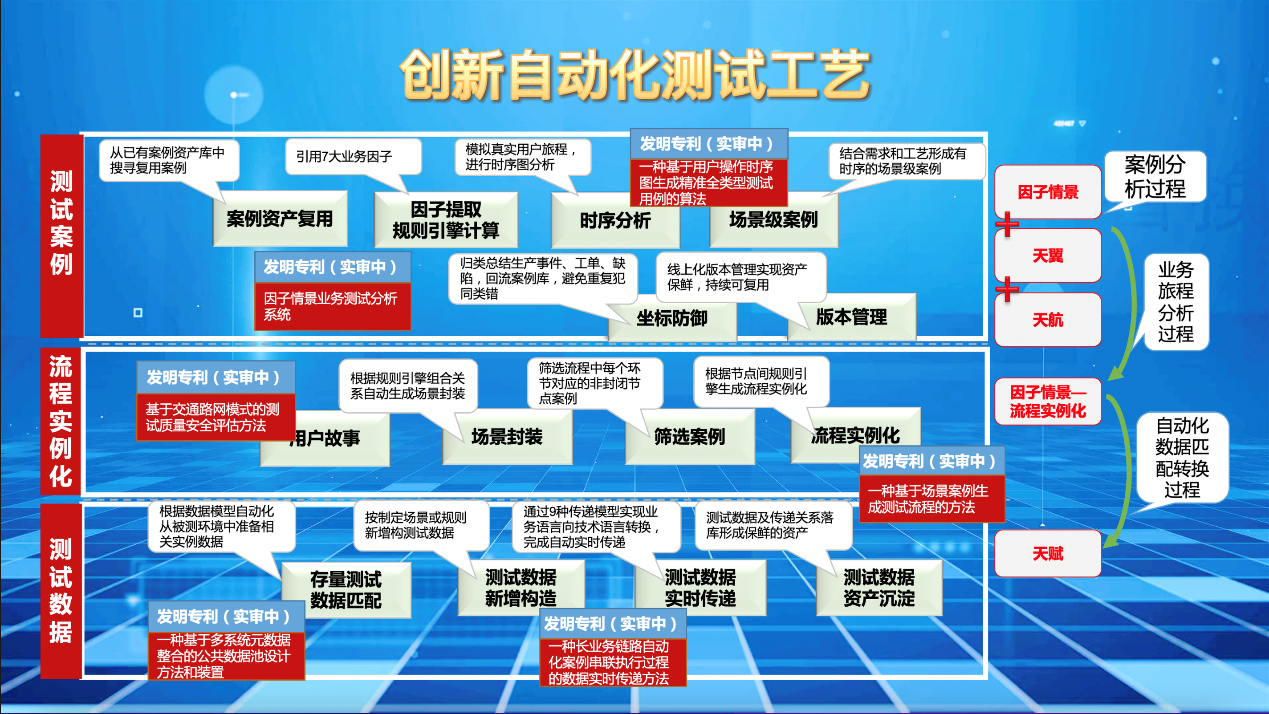 中信銀行守正出奇,圍繞測試全生命周期各階段測試活動,以方法和工藝的突破為先導(dǎo),以工具發(fā)展和資產(chǎn)積累為手段,從人才管理、資產(chǎn)管理、風(fēng)險管理、數(shù)據(jù)管理和性能管理五大維度,逐一擊破痛點。依托92項創(chuàng)新專利,自研40余項創(chuàng)新工具,實現(xiàn)了多項從無到有,從0到1的技術(shù)革新,成功創(chuàng)建了AI智能業(yè)務(wù)解析和數(shù)字化質(zhì)控中臺--五躍天。