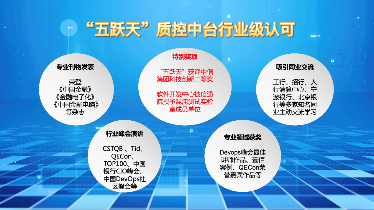 五躍天落地于我行IT研發(fā)實踐質(zhì)效提升顯著,每年節(jié)約測試成功超億元。五躍天已榮獲中信集團科學(xué)技術(shù)二等獎,多次榮登《中國金融》、《金融電子化》、《中國金融電腦》等專業(yè)期刊,與騰訊、阿里專家頂級峰會同臺交流,吸引工行、招行等多家頭部企業(yè)來我行交流,獲得高度認(rèn)可。中信銀行將在初步取得的成果基礎(chǔ)之上,繼續(xù)踐行數(shù)字化發(fā)展路線,全力推進智能質(zhì)量管控生態(tài)的迭代優(yōu)化與實施規(guī)模,充分發(fā)揮金融科技創(chuàng)新價值,塑造可持續(xù)發(fā)展的質(zhì)量管控行業(yè)典范。
