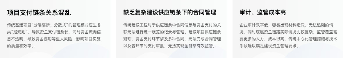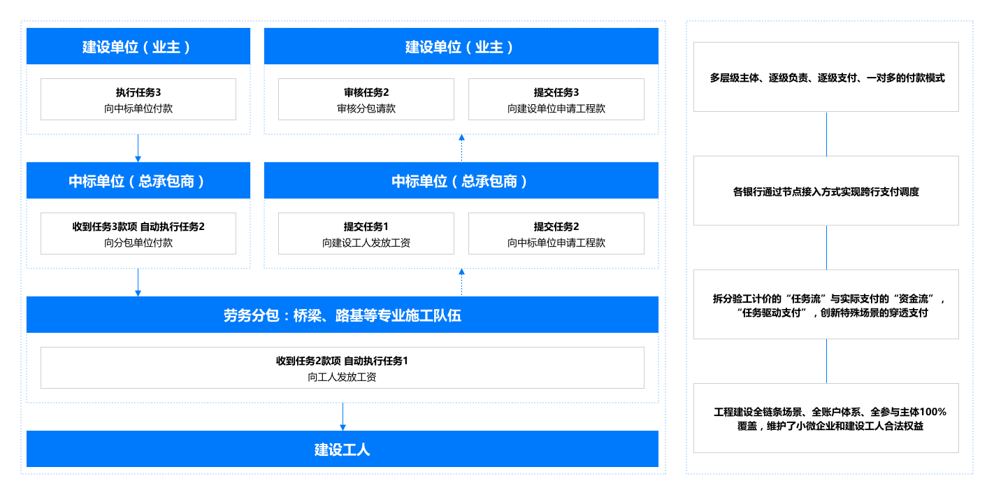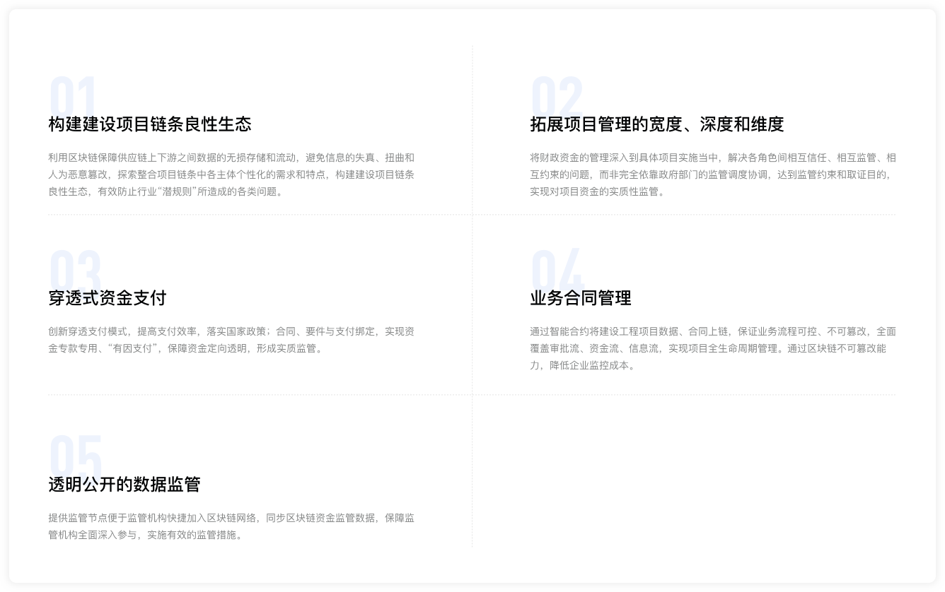 我行依托自主研發(fā)的區(qū)塊鏈底層平臺及快捷協(xié)作云平臺,以"場景+產(chǎn)品+技術(shù)"的增值服務(wù)產(chǎn)品研發(fā)模式,創(chuàng)新性地將區(qū)塊鏈技術(shù)應(yīng)用到建設(shè)項(xiàng)目資金監(jiān)管領(lǐng)域。利用區(qū)塊鏈技術(shù)可溯源、不可篡改等特性及業(yè)界首創(chuàng)的資金多層級"穿透支付"支付體系,將"分層隔斷、霧里看花"的項(xiàng)目施工鏈條"擺上臺面",有效填補(bǔ)了建筑施工項(xiàng)目資金事中管理的相對"空白",以快捷協(xié)作云平臺企業(yè)級模型與組件庫的快捷交付能力,滿足工程建設(shè)單位千家千面使用場景的定制研發(fā)需求,做到系統(tǒng)"易操作、可落地、能推廣"。