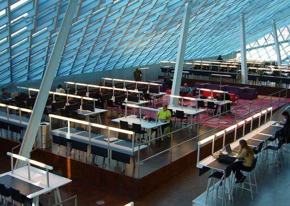 西雅圖中央圖書(shū)館是美國(guó)西雅圖公共圖書(shū)館系統(tǒng)的旗艦館是著名的解構(gòu)主義建筑。它位于市中心,是一幢由11層(56米高)的玻璃和鋼鐵組成的建筑。該館在2004年5月24日開(kāi)放給公眾使用。這個(gè)34000平方米的公共圖書(shū)館容納約145萬(wàn)書(shū)籍和其他資料,其中包括超過(guò)400臺(tái)電腦向公眾開(kāi)放,另設(shè)有一個(gè)地下公共停車(chē)場(chǎng)。頭1年的使用率超過(guò)200萬(wàn)人。圖書(shū)館有一個(gè)獨(dú)特和突出的外觀,構(gòu)成若干分立“浮動(dòng)平臺(tái)”,就像置身在一個(gè)大的蜘蛛網(wǎng)。