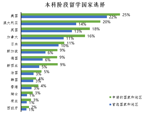 雖然美國、英國、加拿大及澳大利亞等熱門留學國家依然是留學的主流國家,但從占比上看,留學國家的選擇漸趨于分散和多元化。在首選申請方面,主流四國占比約為60%,已經不復早期接近90%的盛況,而去日本、新加坡、德國、新西蘭、韓國等國家留學則逐漸升溫。