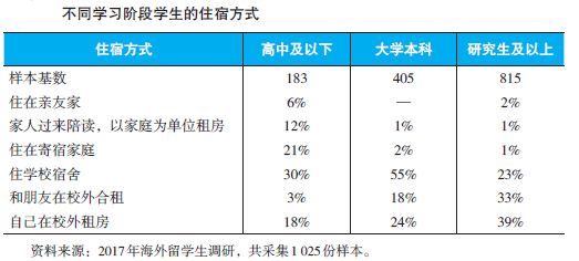 出于年齡的考慮,就讀高中及以下階段的留學(xué)生會(huì)選擇寄宿家庭或有家人過(guò)去陪讀;對(duì)于本科生來(lái)說(shuō),住學(xué)校宿舍是他們的第一選擇,而自己在校外租房及和朋友在校外合租則是本科生的第二選擇和第三選擇;到了研究生階段,選擇自己在校外租房則成為學(xué)生的首選。隨著年齡的增長(zhǎng),學(xué)生越來(lái)越獨(dú)立,也更傾向于在校外租房。